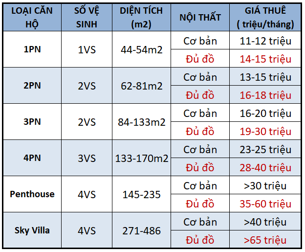 BẢNG GIÁ CHO THUÊ CHUNG CƯ VINHOMES SKYLAKE